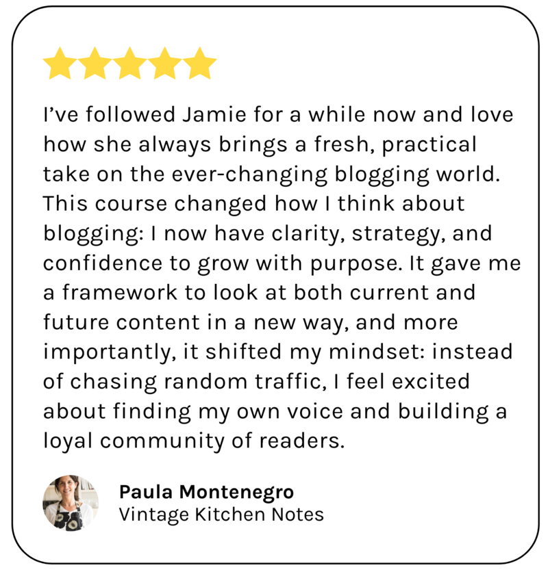 That's why I created The Food Blog Writing Strategy to help food bloggers say goodbye to blog post templates and write smarter blog posts without the typical "SEO filler" so they can rank higher, get clicks, and attract their ideal readers in 2025 and beyond.
